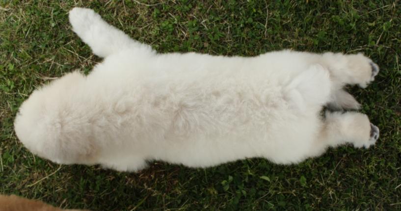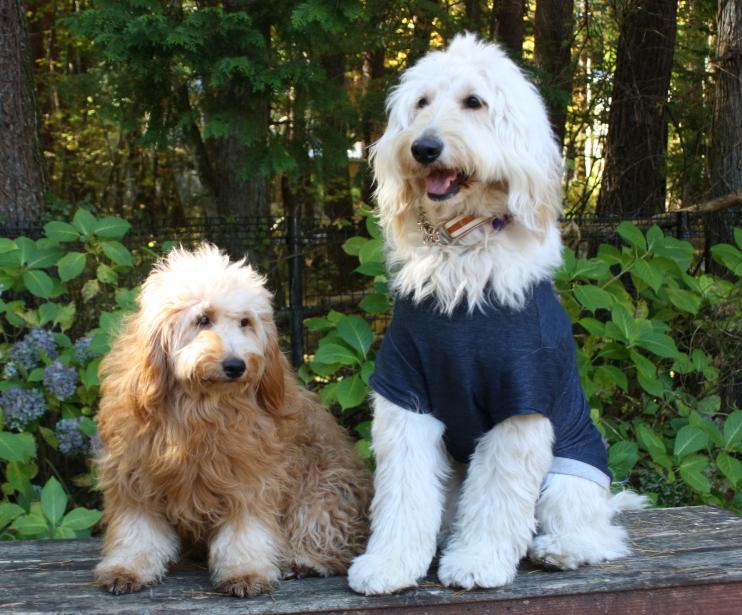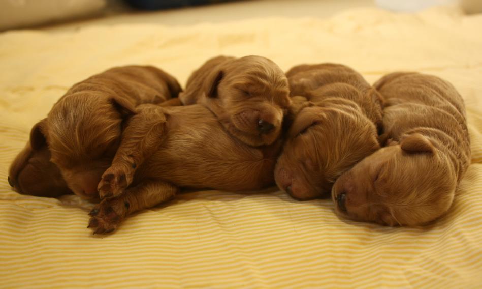 以上の組み合わせが考えられますが、2011年3月トイプードルとの組み合わせでF1bが初出産となりその後、F1・F1bと4例の誕生で合わせて22頭が産れました、出生時の体重は同じ母親のスタンダードサイズの子犬と比べ、約95%とやや小ぶりでしたが成犬時体重は♀で11kg~14kgとサイズ的にはミニチュアサイズに成長し♂は14kg~20kg程で20kgに育った1頭の♂以外は18kg前後でした。サイズの極端に違う交配ゆえ妊娠率が5分の1と極めて低く、今迄に誕生した個体は貴重な存在となります。現在、スタンダードで15kgに収まった♀の個体とミディアムサイズ15kg♂との自然交配にて3世代目のMサイズが産れ育ってます。